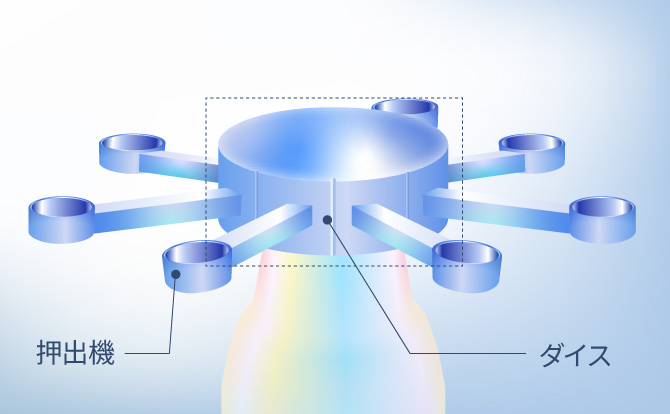 急冷により結晶化を抑制し、透明性と柔軟性に優れたフィルムを成形します。